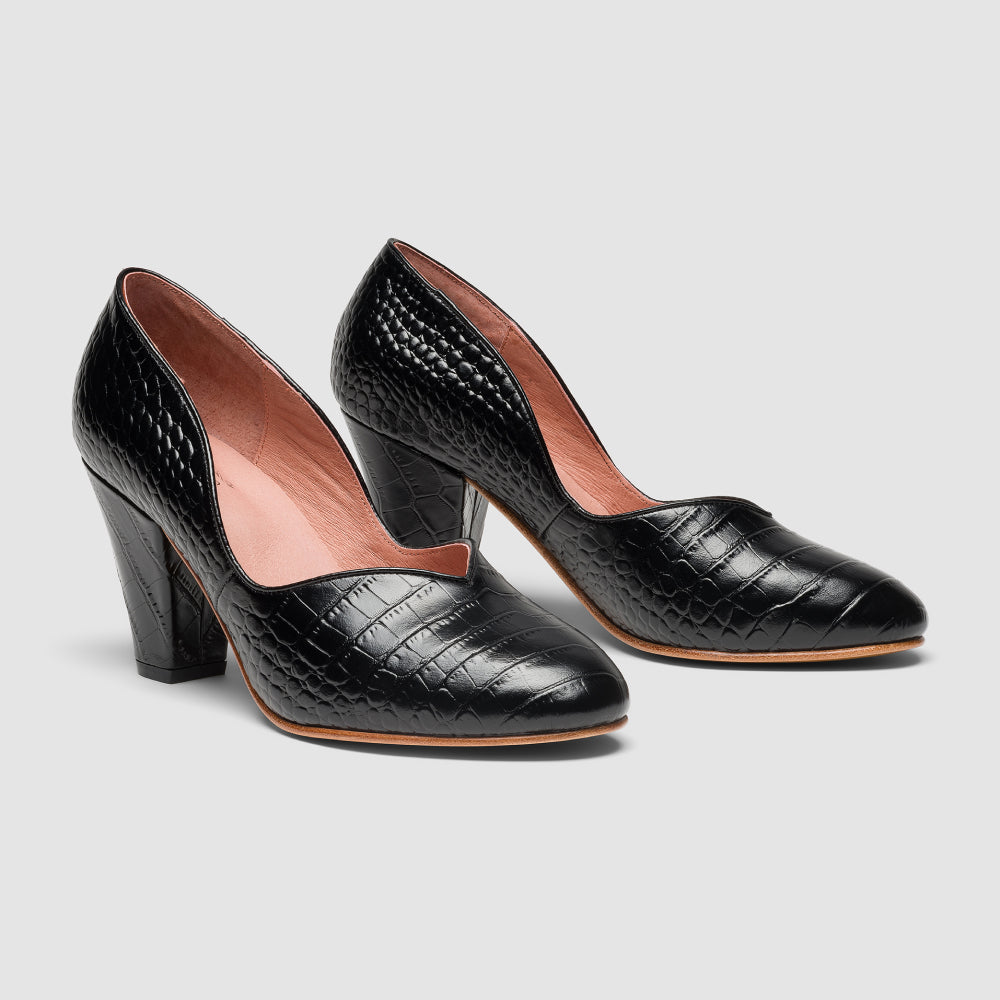 Step into a pair of our famous Marilyn 1940s Pumps, the quintessential vintage slip-on shoe for the late 1930s, 1940s, and early 1950s. Custom embossed leather uppers emulate the elevated, elegant, and in vogue mock croc pumps of the time. These beautiful reproduction shoes feature a curvaceous sweetheart vamp and rounded toes. Our custom 3"/ 7.72 cm reproduction '40s Cuban heel is stable and perfectly balanced for long-wearing comfort. Named for Marilyn Monroe, Marilyn pairs perfectly with just about every outfit for both day and evening.