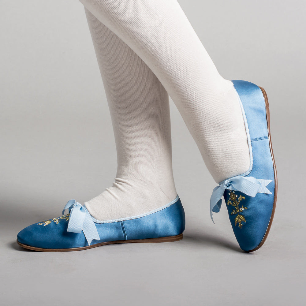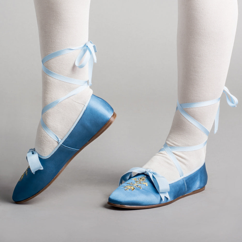 Bring your Regency dreams to life with the perfect pair of delicate dancing slippers. The Penelope slippers offer beauty, comfort, and versatility with so many color pairings, ways to wear the ribbons, and a soft yet durable construction.
