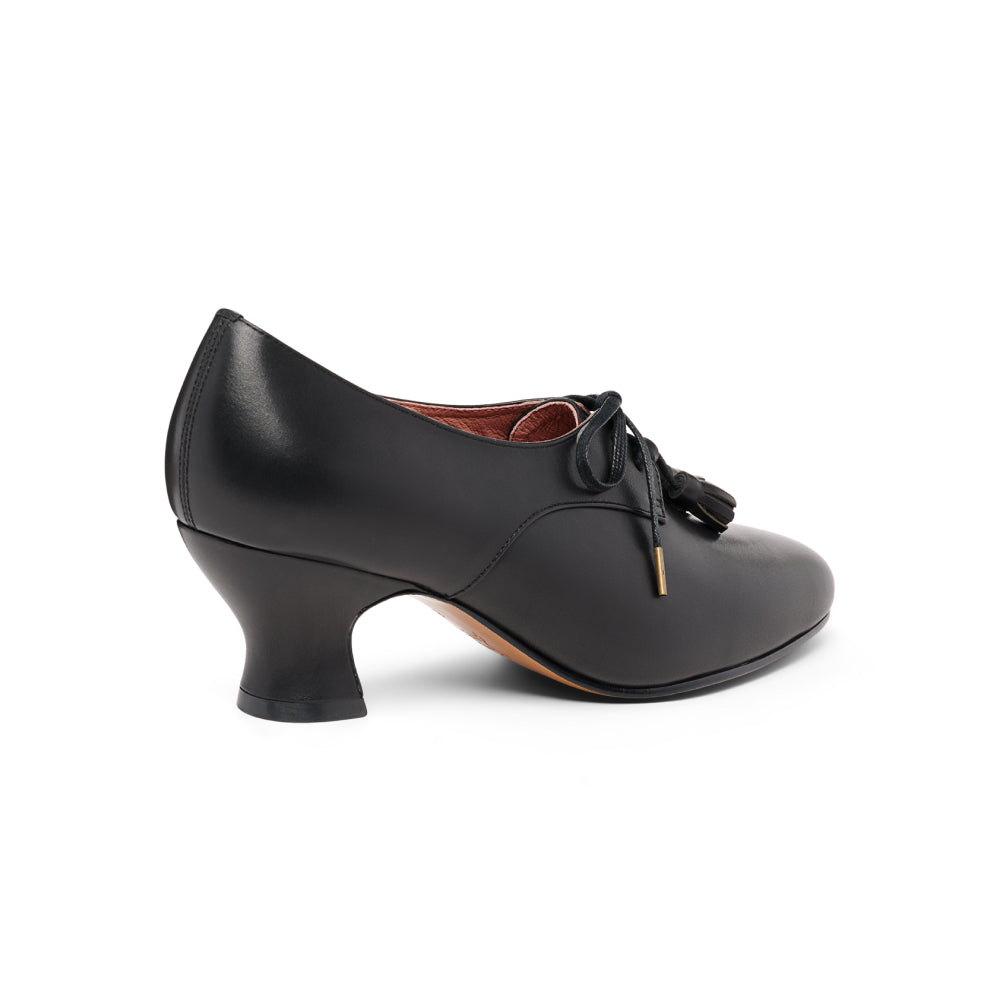 Cordelia is the versatile and attractive Edwardian Oxford everyone needs in their wardrobe. These beautifully crafted shoes are carefully reproduced from period originals, and feature a historical silhouette, lace-up closures, and removable decorative tassels. Cordelia is built on our custom, perfectly balanced, 2"/5.08 cm French spool heel, so you can walk comfortably in style. Available in a selection of neutral-colored leathers, Cordelia blends seamlessly into the leg line for a sleek and sophisticated look that goes with any ensemble. Cordelia comes in both standard and wide widths.