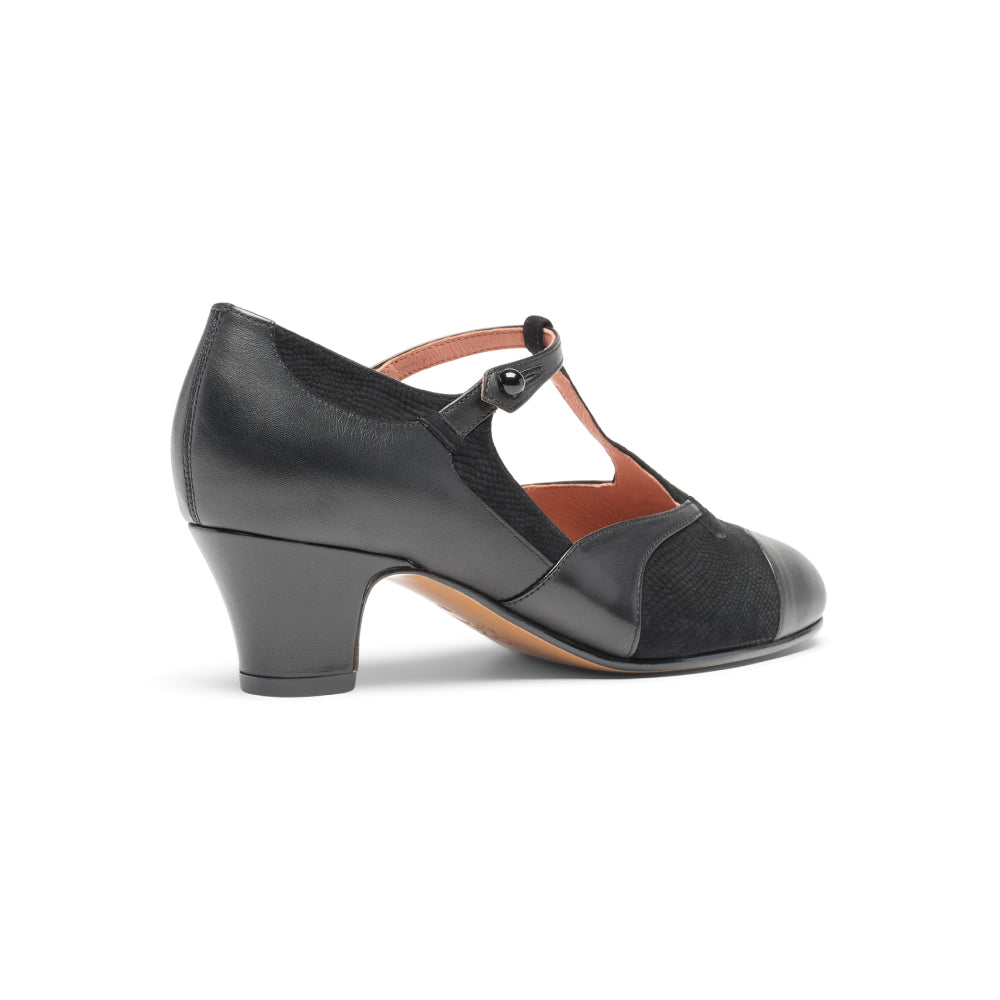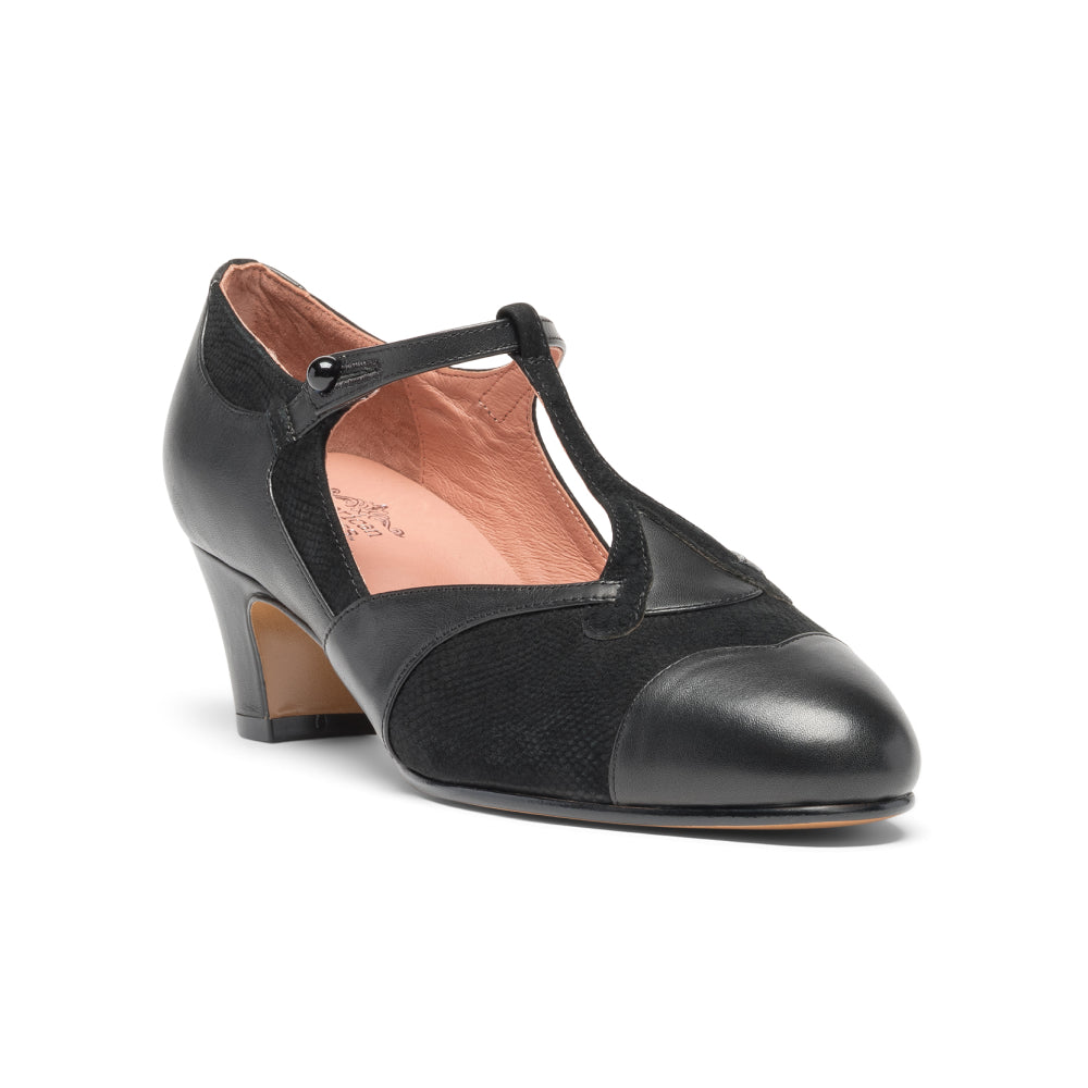 The hunt for a chic and unique 1920s daywear shoe is complete with Doris, a lovely serpentine and strappy pump. Beautifully cut smooth leather foxing intertwines with python-embossed leather or suede in rich color combinations, set off by a finely detailed strap with a functional button closure. Doris is built on a period-accurate and comfortable 1920s last, with a low, perfectly balanced 1.75"/4.45 cm Cuban heel. Doris is available in regular and wide width.
