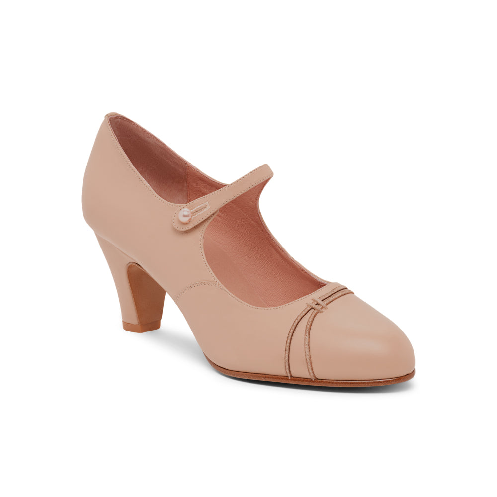 Get ready to cut a rug with Vera, our classic 1920s bar shoe. Modeled after historic originals, Vera features a quintessential strap across the instep, complete with a functional button closure. Vera's uppers are decorated with graceful suede piping in coordinating colors. Made with a new, period-accurate 1920s last, Vera is built on our custom 2.5"/6.35 cm Spanish heel, which is perfectly balanced for comfort. Vera is available in a selection of neutral-colored leathers for a sleek and streamlined look that adds versatility to your wardrobe. This darling bar shoe goes with just about anything! Vera comes in both standard and wide widths. A button hook is recommended to easily close your Vera Bar Shoes.