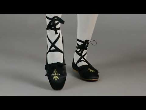 These slip-on shoes are accurate for c. 1800 - 1830. They feature a beautiful satin upper embroidered with a historical design on the vamp, complete with spangles. The edges are bound in petersham, with matching optional ankle ribbons and vamp bow which is easily removed. Period-correct turnshoe construction, soft square toe, and real leather soles make the Penelopes unmatched for evening and formal events where the prettiest of shoes are required. Wear them for Jane Austen, Napoleonic, War of 1812, and all Regency events.