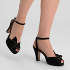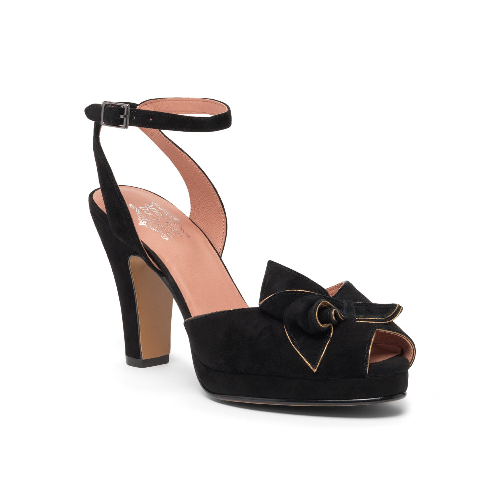 The glamorous platforms of the 1940s come to life with Ava, a veritable vintage knockout. Built on a new period-accurate reproduction last, Ava has a 0.6"/1.5 cm platform under the toe, providing lift and balance to match our custom, perfectly balanced, 4"/10 cm Spanish heels. Ava's uppers are crowned with a detailed, folded leather decorative bow, with smooth leather piping in coordinating colors. Ava's ankle straps are secured with a smart rectangular buckle, just like the originals from the 1940s. Ava pairs with your contemporary wardrobe just as well as your favorite pin-up inspired ensembles.